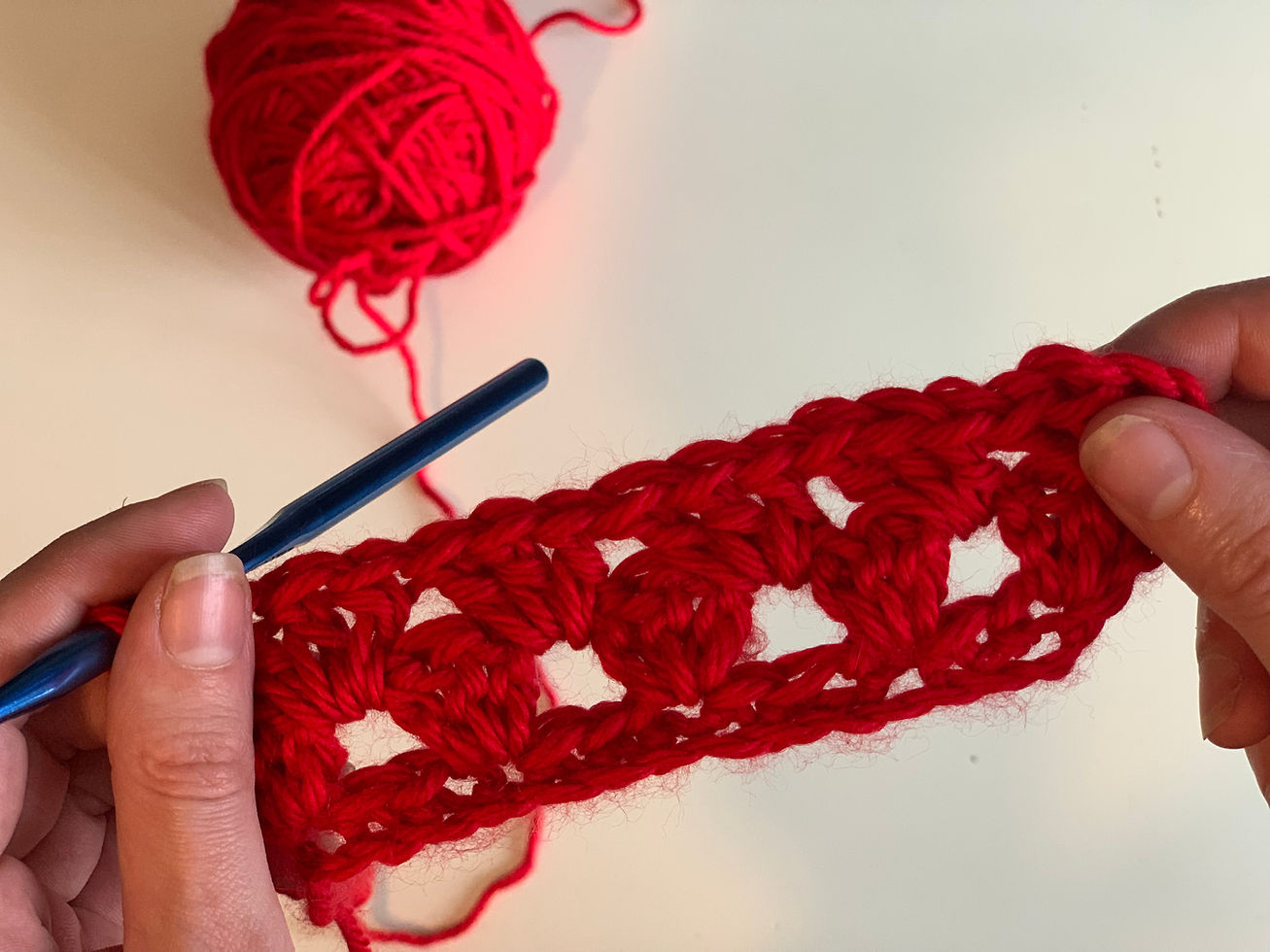 To start your first row, chain three. This will act as your first double crochet of the next cluster.